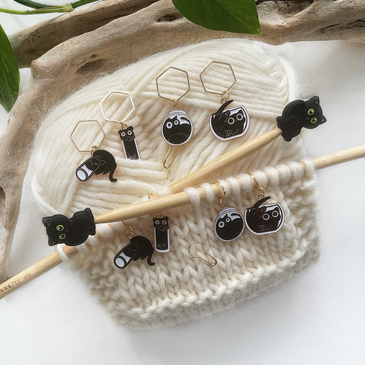 STITCH STOPPERS + MARKERS Set, 2 Green eyed Black Cat Stoppers + 5 fixed and removable markers + storage jar, Knit & Crochet