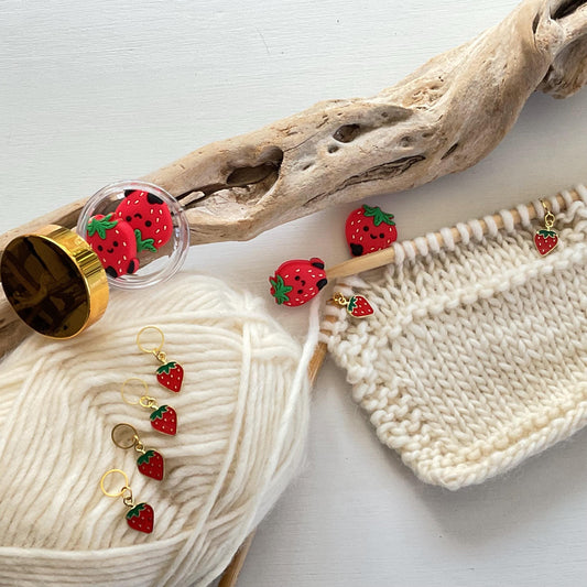 STITCH STOPPERS + MARKERS Set, 2 Strawberries stitch Stoppers + 4 fixed or removable strawberry stitch markers + storage jar, Knit & Crochet