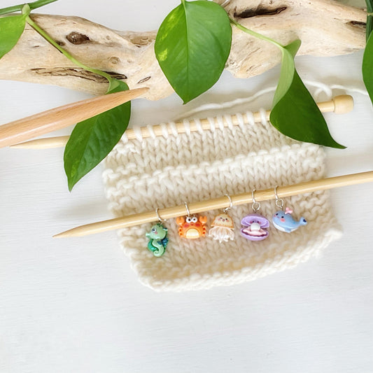 INTO THE SEA Set of 5 Stitch markers, knit or crochet progress keepers, choose your findings, includes storage jar + lid
