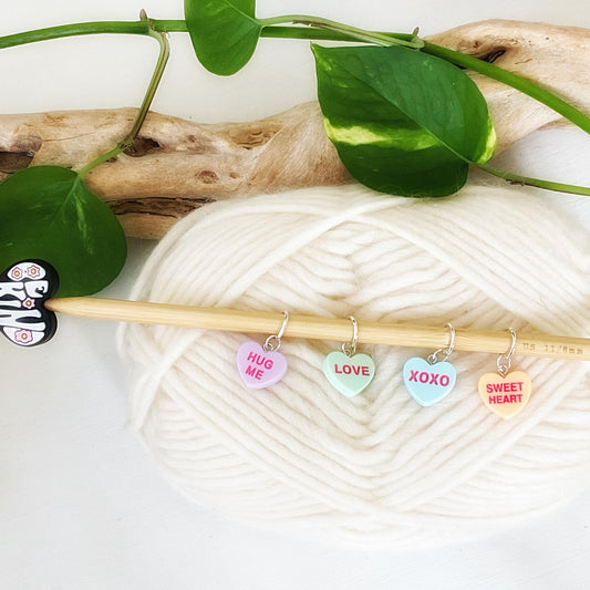 Looks like CANDY HEARTS but they are stitch markers for knit or crochet set of 4 hearts + storage jar w/ lid, different sayings