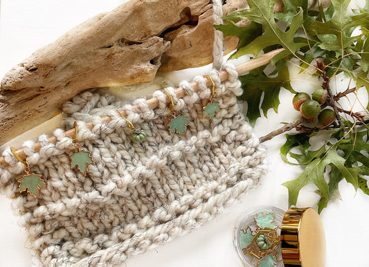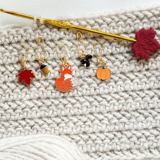 AUTUMN in the FOREST set of 5 metal + enamel knit or crochet stitch markers: leaf, acorn, fox, squirrel, & pumpkin + storage jar w/ lid