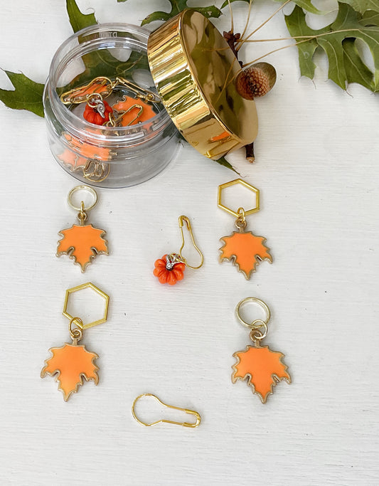 AUTUMN LEAVES + Pumpkin Knit + Crochet set of 6, autumn orange enamel and gold tone stitch markers
