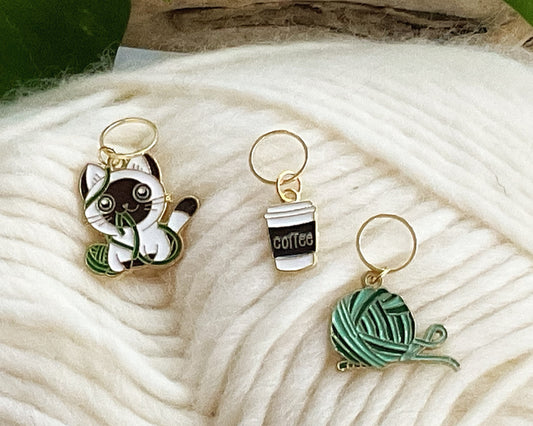 CATS +COFFEE +YARN Stitch Markers Set of 3 adorable enamel fixed or removable markers + storage jar + lid Knit and Crochet markers