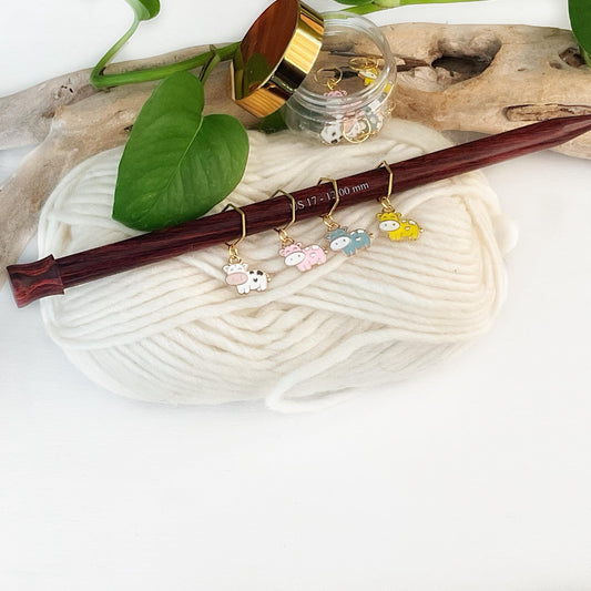 BARNYARD Animals - CHICKEN, Cow, SHEEP or Owl, Knit + Crochet set of 5 colorful enamel Stitch Markers + elegant storage jar + secure lid