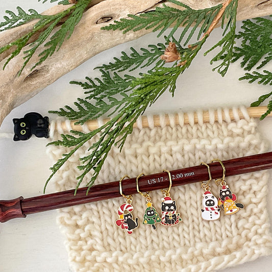 CHRISTMAS BLACK CATS Set of 5 knit + crochet stitch markers + storage jar/ lid