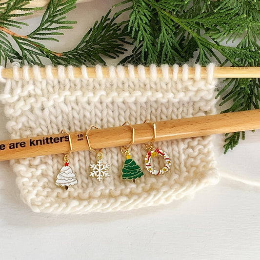 CHRISTMAS TRADITIONS Set of 4 knit + crochet white and green stitch markers + storage jar/ lid choose your findings tree, wreath + snowflake
