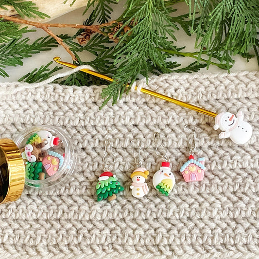 CHRISTMAS KAWAII Set of 4 knit + crochet stitch markers + storage jar, dancing tree, animated ornament, snowman + pink gingerbread house