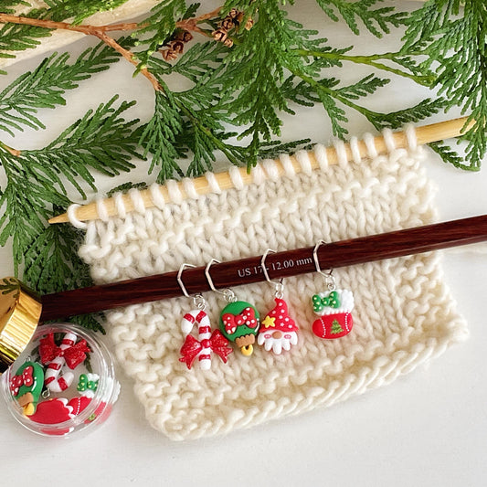 CHRISTMAS GNOME Set of 4 knit + crochet stitch markers + storage jar with candy cane, Santa gnome, ornament + stocking, choose you findings