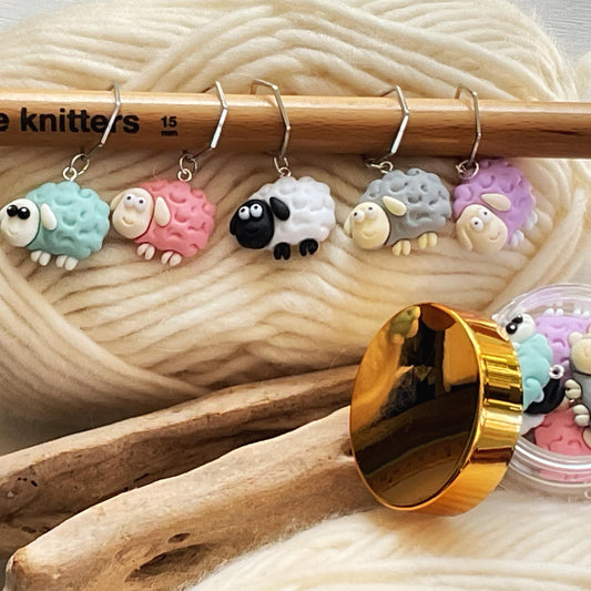 COLORFUL SHEEP Set of 5 Stitch markers, knit or crochet progress keepers, choose your findings, includes storage jar + lid