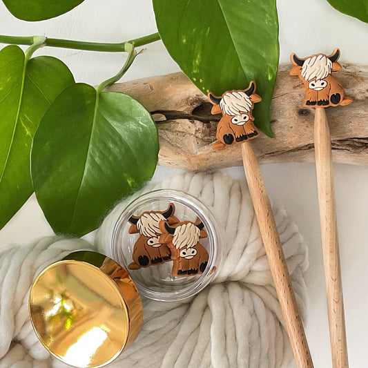 HAIRY COOS Knitting Needle Stitch Stoppers/Point Protectors, Adorable Highland Cows, Khaki or Caramel color, Set of 2, storage jar optional