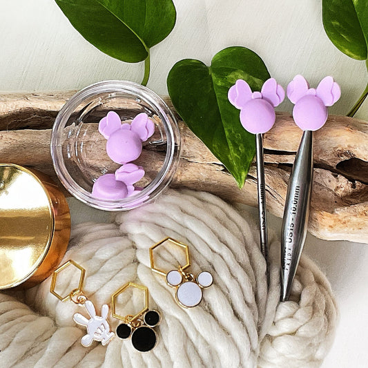 Knitting Stitch Stoppers, Cute Mouse Ears stitch stoppers, Minnie Head Set of 2 knitting needle point protectors, choice of 5 colors