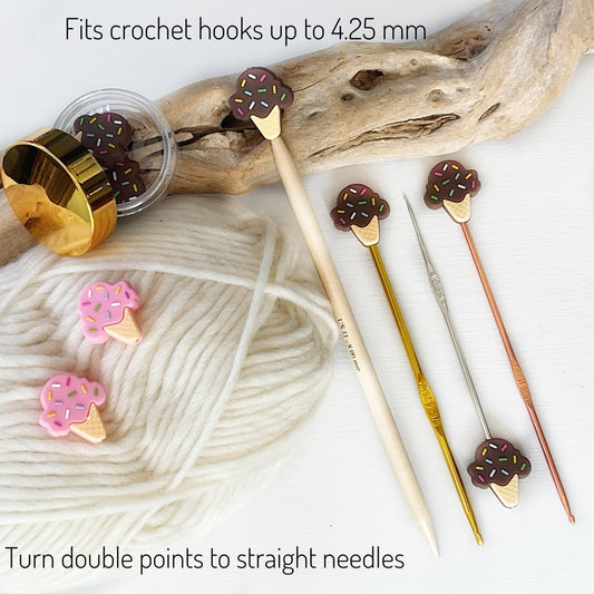 ICE CREAM CONES set of 2 stitch stoppers+ keep your stitches safe Strawberry or chocolate + sprinkles knitting needle point protectors