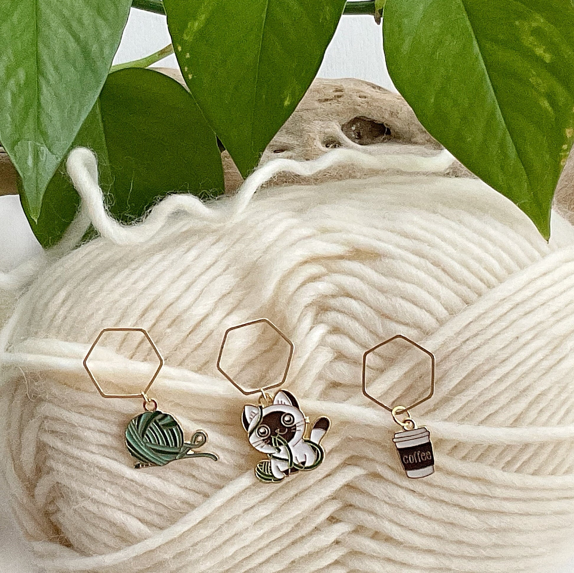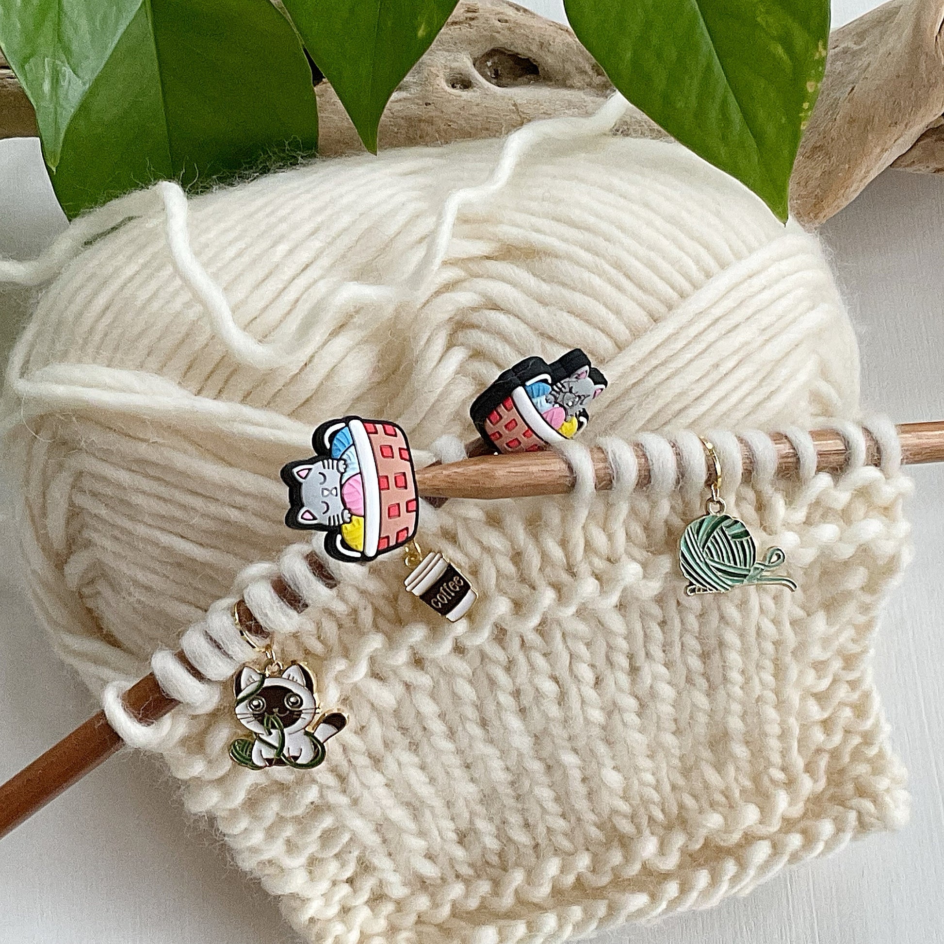 This fun and adorable set of Cat and Yarn themed stitch stoppers and stitch markers is filled with knitter favorites: Cats, coffee AND yarn!! Stitch marker set includes 4 knit or crochet stitch markers. The playful set includes elegant holder with secure gold lid to hold your 4 gold tone stitch markers and 1 set of 2 Carin a basket of yellow, blue and pink yarn balls stitch stoppers. Stitch stoppers fit size 3mm (US 2.5) - 10mm (US 15).